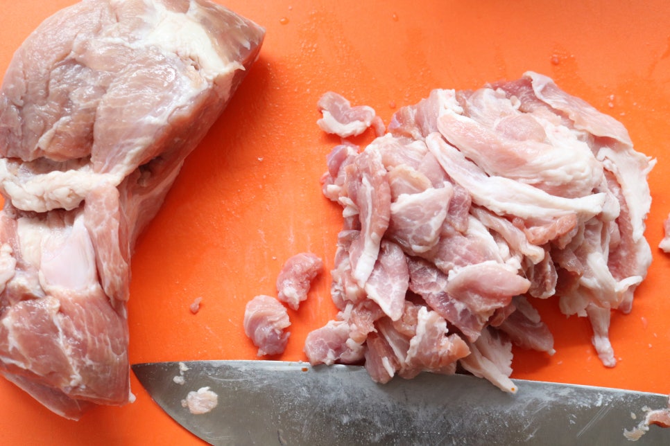 1. µÅÁö°í±â¸¦ ¸Ô±â ÁÁÀº Å©±â·Î Àß¶óÁÝ´Ï´Ù.